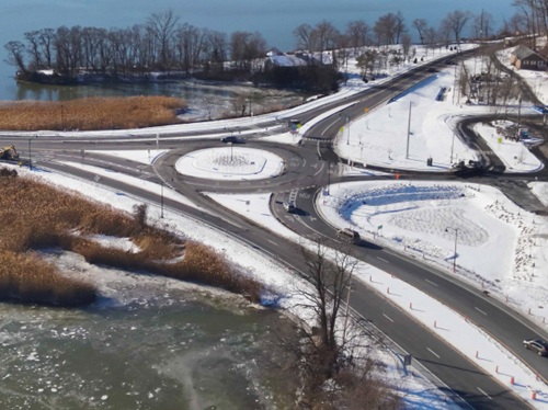 NYSDOT said the path totals 925 feet with a minimum width of five feet and a three-foot curb buffer to separate bikers and walkers from vehicle traffic. The new roundabout also features new LED street lighting and new pedestrian crosswalks, and in the spring, crews will add native trees, shrubs, and grasses.